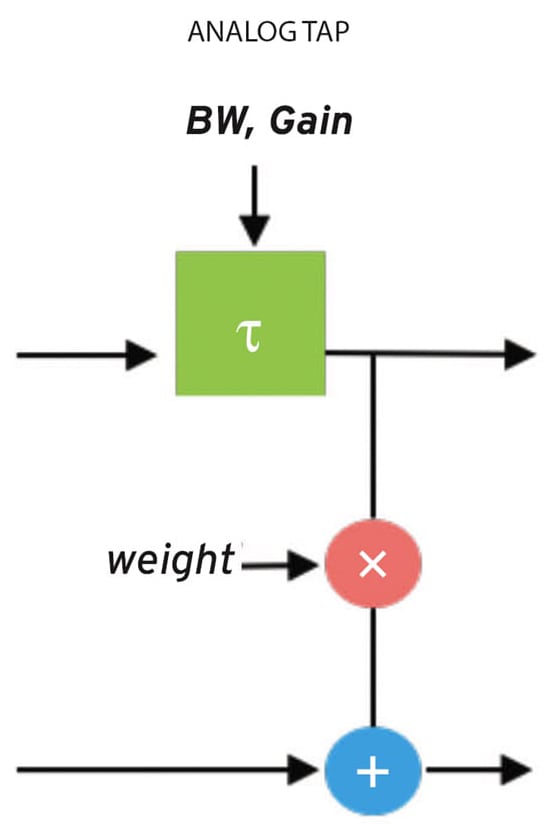 As the only commercially available solution to embed long delay elements in a standard CMOS chip, the Kumu Networks KU1500 RFIC changes the existing paradigms (Figure 2). The software-controlled analog filter designed for wireless applications is essentially a multi-tap implementation in which each tap packs an adder, multiplier, and delay element (Figure 3). By adjusting the weights of its multipliers through a digitally controlled API, any desired filter response can be configured.