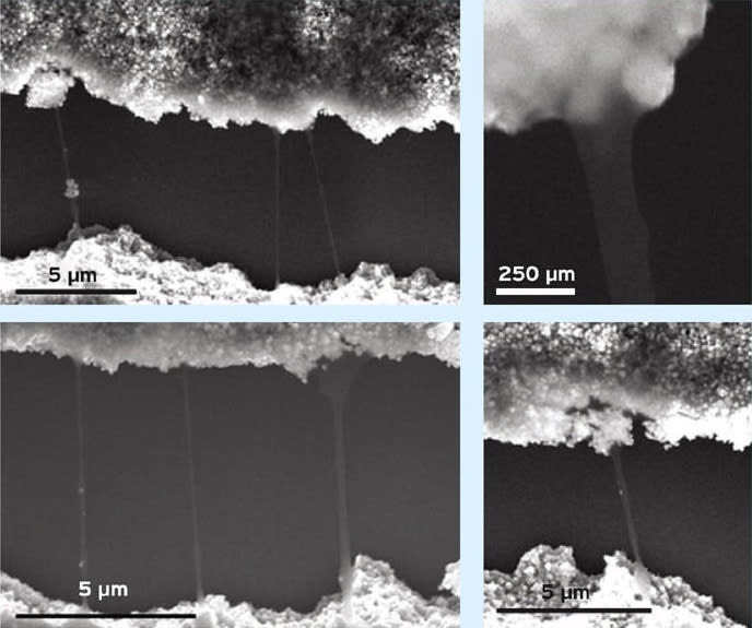 To minimize the detrimental effects of severed metal busbars and gridlines on solar cell performance, this research explored incorporating multiwalled carbon nanotubes (MW-CNTs) into silver (Ag), forming a metal matrix composite (MMC). It was discovered that with proper CNT surface functionalization and judiciously designed composite microstructure, the CNTs in MMC gridlines can electrically bridge gaps greater than 40 μm. The scanning electron micrograph (SEM) images in Figure 2 conceptually demonstrate this composite engineering strategy, where the CNTs mechanically and electrically bridge the gaps in severed MMC gridlines, providing redundant electrical conduction pathways.