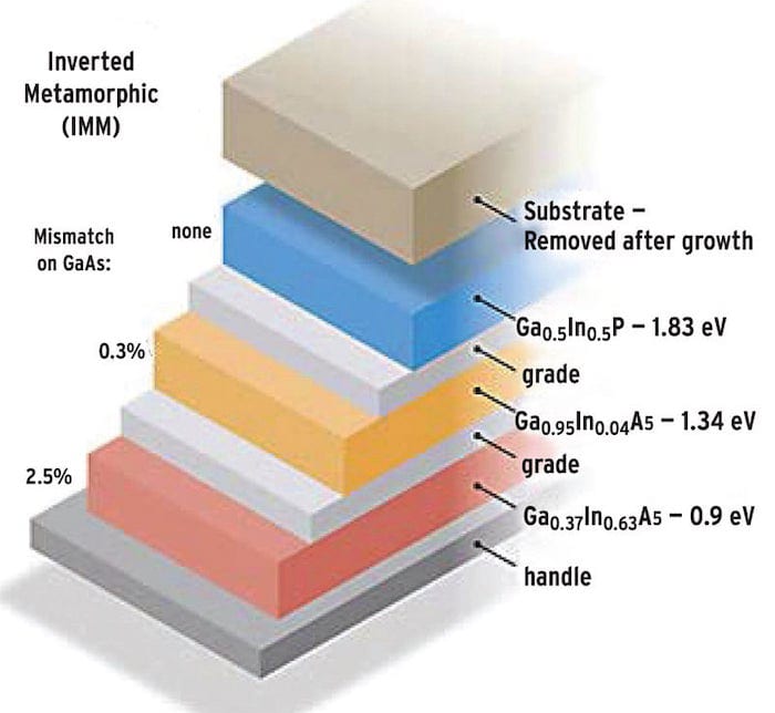 In recent years, for improved performance over the state-of-practice TJ cells, other cell architectures are being explored, such as inverted metamorphic multijunction (IMM) solar cells. Figure 1 shows a schematic view of IMM cell architecture, where InGaP and InGaAs subcells are sequentially grown on a lattice-matched substrate. After completing the growth, only the stack of active layers is exfoliated and transferred to a lightweight handling substrate, where the stack is inverted, such that the InGaP layer faces the sun. This new architecture eliminates the use of Ge substrates, as well as the Ge bottom cell found in traditional TJ solar cells, providing better current matching, higher efficiency, and lighter weight.