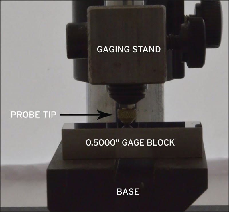 An example demonstrating repeatability can be seen in Figure 1, which shows a spring-loaded position sensor in a typical gaging stand being calibrated with a precision gage block of 0.5000-inch dimension. The sensor delivers an output of 0 to 10 Volts DC full scale for 0- to 1-inch of probe movement. The tip of the sensor is moved inward to allow the gage block to be inserted between the tip and a flat base, and then released to contact the block. In five trials, system outputs are: 5.0012, 5.0016, 5.0013, 5.0010, and 5.0015 Volts DC. The average value is slightly over 5.0013 Volts and the maximum variance is ±0.0003 Volts, which is equal to ±30 ppm of FSO, or 0.003% of FSO.