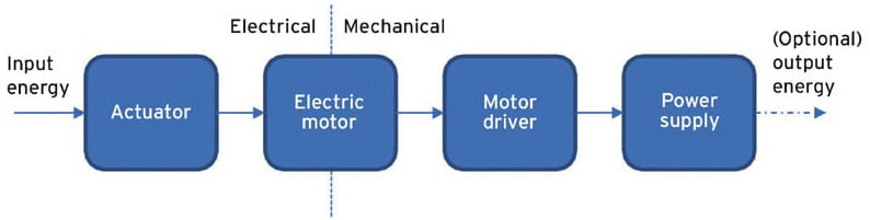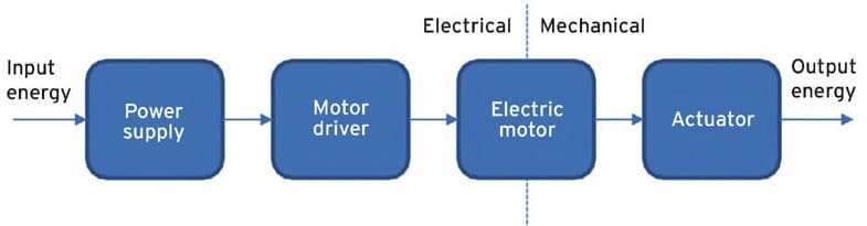 Figure 2 depicts the conversion of energy from electrical input to mechanical output. Electrical energy is input to a power supply. The power supply converts the input energy into a form that can be used by the motor drivers [i.e., alternating current (AC) to direct current (DC)]. The motor driver applies the energy from the supply to the motor as necessary to obtain the intended motion. The electric motor then converts the electrical energy into mechanical energy. The output of the motor is typically mated with some form of mechanical actuator that converts the motor’s output to the intended motion. At each point in the conversion process, some energy is lost due to inefficiencies in the system.