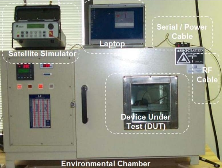 Accelerated failure testing validated the derived diagnostic feature set. Accelerated failure tests were conducted by placing a GPS receiver, or the Device Under Test (DUT), into an environmental chamber exposing the DUT to thermal cycling. During the test, the DUT received a constant reference signal from a GPS satellite simulator located approximately six feet away. A laptop monitored the features using a RS-232 connection. Thermal cycling halted every 100 cycles to record 24 hours of live constellation data. The cycle time between data collections lasted 40 minutes. Figure 1 shows the setup for the accelerated failure test.