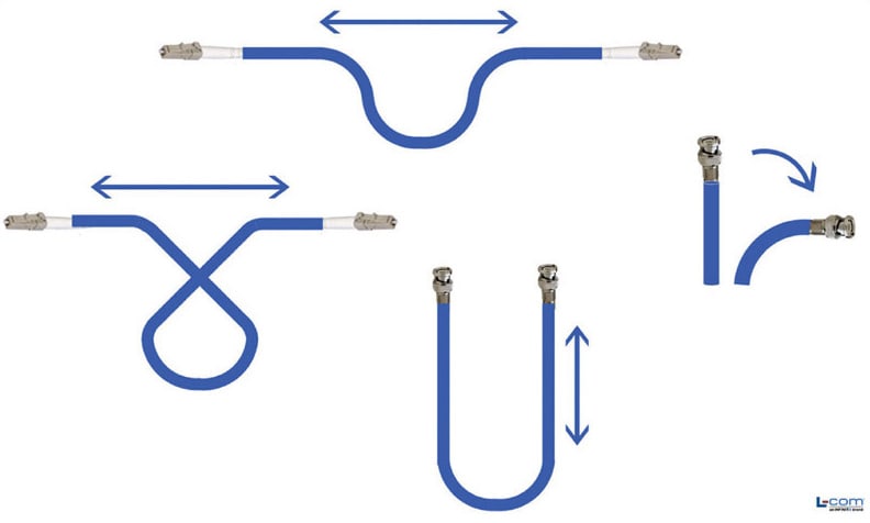 Extensive bending and flexing of a coax can be necessary in automated test systems or systems that require high speed video transport such as aerospace surveillance where a cable will be subjected to flexing and vibrational strain. As stated earlier, fiber optic cables are particularly susceptible to long-term damage from excessive bending and even in cases when the bend is static since microfractures can spread and slowly deteriorate cable performance. From beam theory, the simplified equation for bending stress on a cylindrical beam of homogeneous material is [3]: