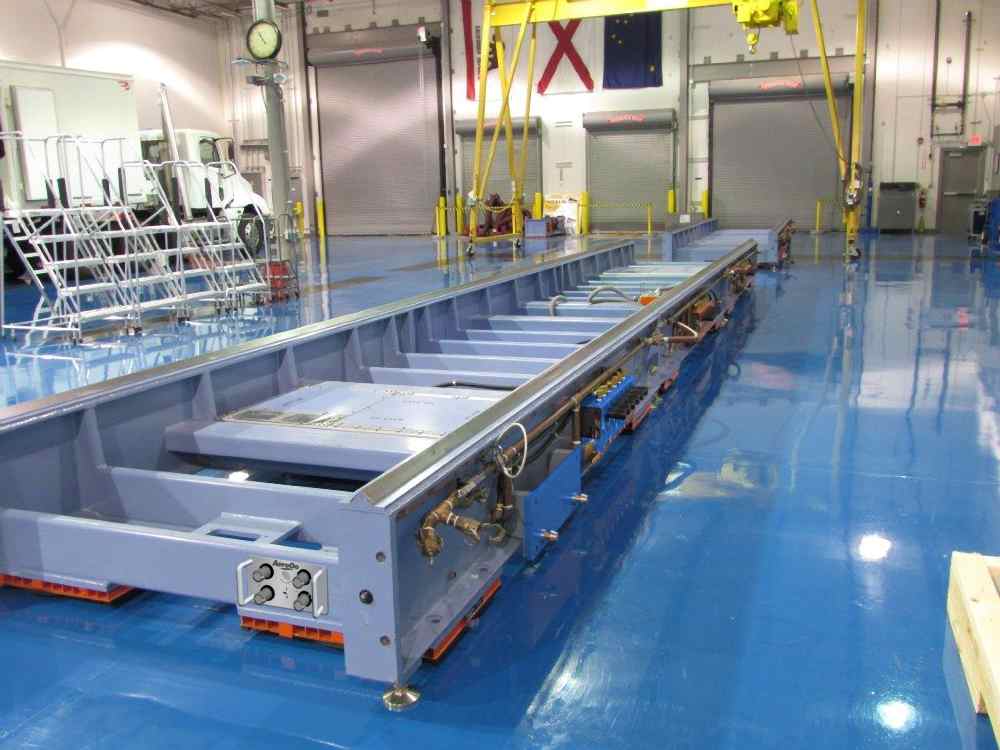 Air bearing systems utilize compressed air to lift and float heavy machines, structures and tooling within their own footprint. Air bearing technology works similar to a puck on an air hockey table, in that it eliminates friction – making heavy loads easy to move – and it floats on the surface without damaging the floor. This material handling method is inherently safe to operators due to very low lift height and reduced friction/low chance of strain. The embedded air bearing system is permanently integrated into the tool, machine, or structure. Wheeled casters, footers or bases are fitted with air bearing modules and a control console for adjustable air control.