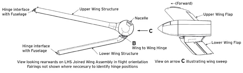 The joined-wing assembly consists of UW, LW and Nacelle structures. Each UW or LW structure includes a flap for trimming and stability purposes. The UW and LW structures interface with the fuselage separately via hinges, identified in Figure 3. The two wings are joined at their outboard tips through a connecting structure, known as a ‘cradle’, which also supports the nacelle. The cradle is part of the UW structure and features two lugs to realize the connection with the LW.