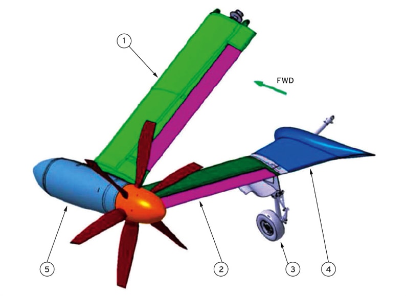 UW and LW structures feature opposed dihedral and sweep angles with a positive stagger arrangement at their roots, forming a triangular framework in both front and top views. The upper wing is connected to the upper fuselage whereas the lower one is connected to the stub wing part of the lower fuselage. Lateral pushing propellers are located at the wing joint region, behind the trailing edges, offering improved characteristics in terms of passenger safety and crashworthiness.