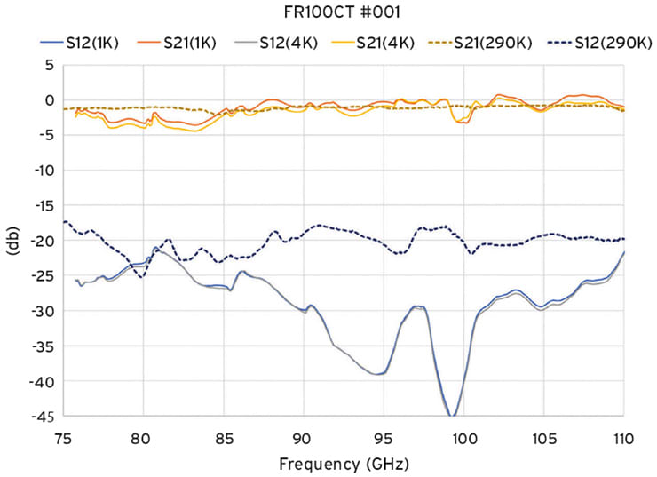 It is essential for any MMW application that each isolator is tested over the full frequency band on a vector network analyzer (VNA) to ensure compliance. This includes reliability testing (Belcore) and cryogenic cycling tests. Comprehensive VNA test data should back up every component since there are often signatures in the data that can be missed. “Knowing that isolators would now perform in the MMW bands at single-digit Kelvin temperature was good news for us because that was one less component we had to worry about,” said Anferov.