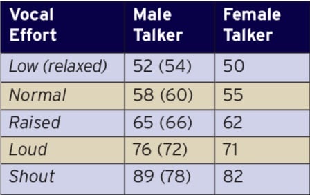 The speech levels referenced above are the levels measured in front of the talker’s mouth. However, the vocal source is quite directional and the levels at the talker’s back may measure up to 5–7 dB lower. This difference is relatively small at low- and mid-frequencies but sharply increases for spectral content at higher frequencies (consonants).