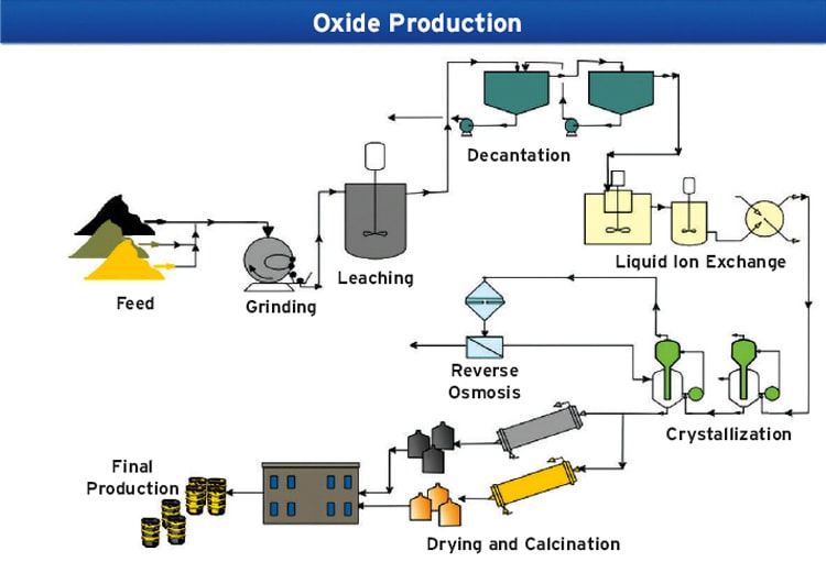 The materials are fed to the plant at Hot Springs and vanadium is leached into the aqueous phase. After separation of the solids, the pregnant liquor is fed to an ion exchange/solvent extraction process, which effectively removes any metal contaminates that may have come into solution during the leaching process. The clean pregnant liquor is then fed to multistage growth type crystallizers where relatively large orthorhombic crystals of ammonium metavanadate are precipitated. The crystals are washed, dried and decomposed to form either V2O5 or V2O3. The high purity oxides can be used for production of master alloys for the titanium and aerospace industries, or they can be converted into other downstream vanadium chemicals and alloys for various applications.