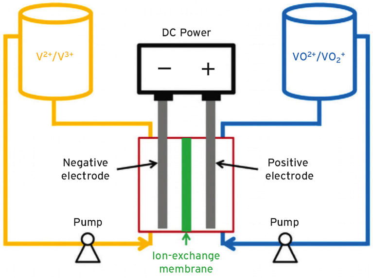 VRB systems consist of an assembly of power cells in which two vanadium-based electrolytes are separated by a proton exchange membrane. The main advantages of the VRBs are (a) their nearly unlimited capacity, which is made possible simply by using sequentially larger storage tanks; (b) their ability to be left completely discharged for long periods of time with no detrimental effects; (c) the ease of recharging them by replacing the electrolyte if no power source is available to charge it; and (d) their ability to withstand permanent damage if the electrolytes are accidentally mixed.