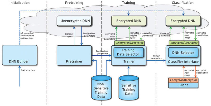 In the initialization phase, the DNN Builder converts the original structure into a homomorphic encryption-compliant structure and functions. It also adds extensions to the DNN to support resiliency to black box attacks. In the pretraining phase, the Pretrainer performs initial training of the unencrypted DNN with non-sensitive data, so the DNN begins to converge to its final state without revealing any sensitive data. The semi-trained parameters are then sent to the Trainer, which finalizes the DNN parameters in the training phase with encrypted non-sensitive and sensitive training data. Finally, in the classification phase, the Classifier Interface accepts input data from the client, selects DNN parameters from a set of DNN variants, and calculates a classification confidence that is only fully decrypted at the client.
