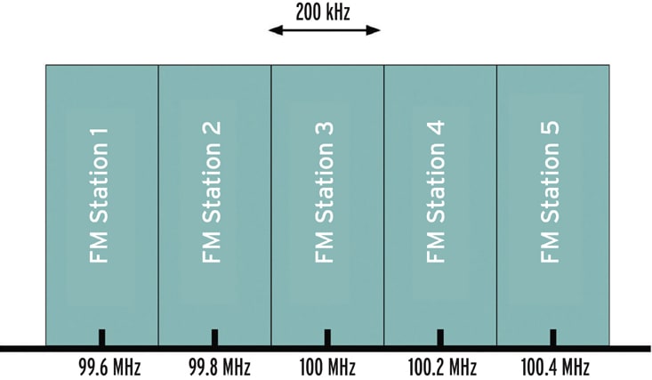Let’s observe the hypothetical FM broadcasting scheme shown in the figure above. Every station takes 200-kHz bandwidth but all of them are transmitted at different carrier frequencies. To listen to FM Station 3, the radio receiver needs to obtain its specific 200 kHz of information. This was done using a process called tuning in early receivers where the frequency of the receiver was adjusted to the carrier frequency of the channel of interest.