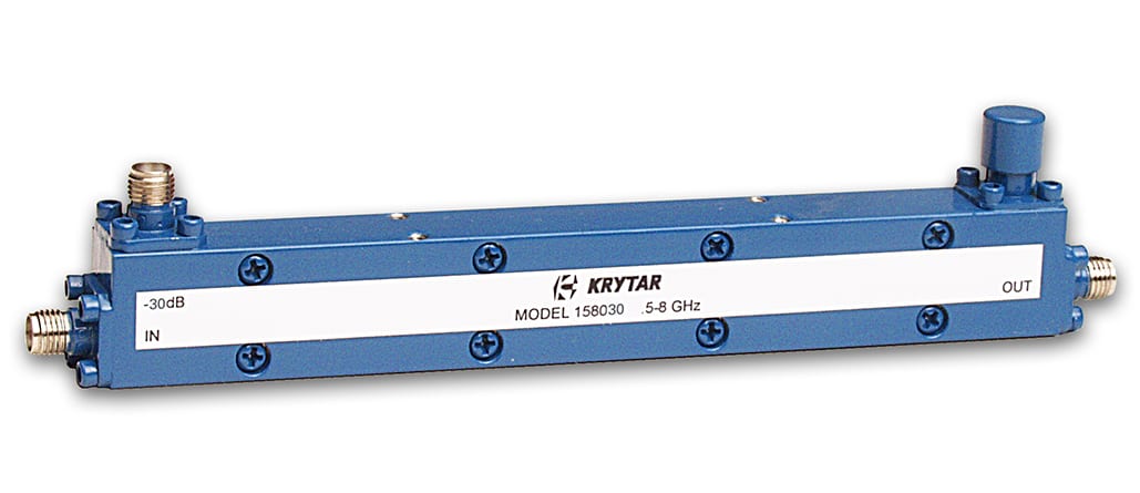 KRYTAR, Inc., (Sunnyvale, CA) announced a new directional coupler operating in the frequency range of 0.5 to 8.0 GHz offering Nominal Coupling (with respect to output) of 30 dB, ±0.8 dB in a compact package. KRYTAR’s Model 158030 also offers frequency sensitivity of ±0.6 dB. The directional coupler exhibits insertion loss (including coupled power) of less than 0.80 dB, directivity of greater than 16 dB, maximum VSWR (any port) is 1.35, input power rating is 20W average and 3 kW peak. The compact package measures 5.25 inches (L) × 0.53 inches (W) × 0.72 inches (H), and weighs only 3.8 ounces. Operating temperature is -54° to +85° C.
