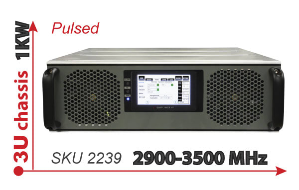 Empower RF (Inglewood, CA) announced the release of their Model 2239 pulsed driver amplifier producing a minimum of 1KW peak power. The 2239 is an intelligent amplifier in a compact 3U rack compatible footprint with features ideal for integrating into Magnetron, IOT, Klystron and TWT systems. The amplifier is designed for 0-dbm input that is pulse modulated. A fast TTL gate input is standard, and its use optional when complete shutoff of the output stage is desired between pulses. Pulse capabilities include up to 20% duty cycles and pulse widths as long as 500 μsec with up to 25 KHz PRF’s. GaN on SiC devices are used in a multistage class AB configuration.