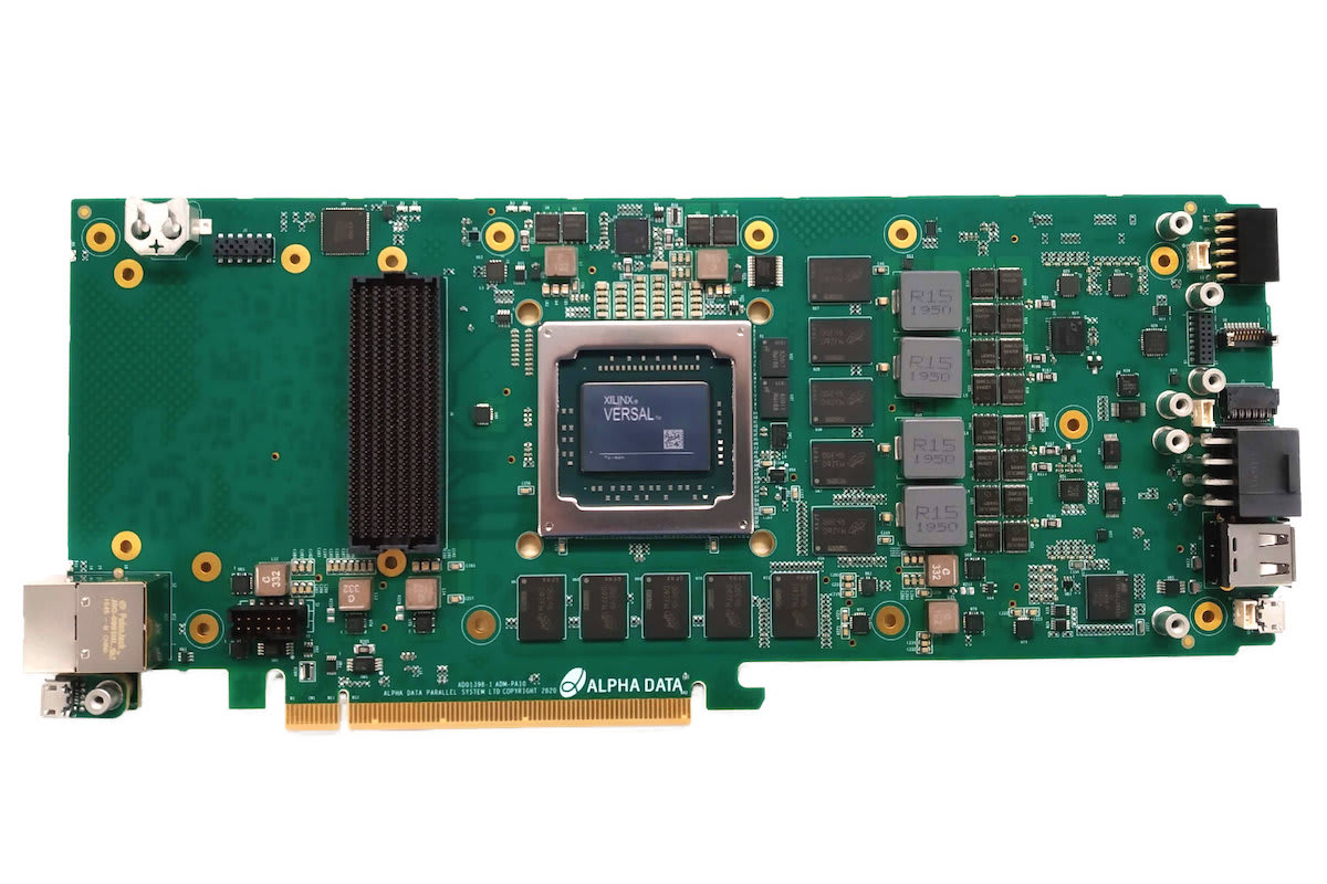 Alpha Data (Golden, CO) released the ADM-PA100, the first deployable adaptive computing acceleration platform (ACAP)-based data processing unit suitable for PCIe deployment. The ADM-PA100 is based around the Versal AI Core series, which includes an array of Xilinx AI Engines (dedicated VLIW processors, capable of Vector Math Processing at compute densities 5x higher than programmable logic). The Xilinx Versal series of devices also feature an on-chip Programmable NoC, dedicated hardened IP for Multi-Rate 100G Ethernet, hardened PCIe Gen4 endpoints with DMA outside the programmable logic, hardened DDR4 memory controllers, built-in ARM A72 and R5F CPUs, and programmable logic and DSP performance a generation on from UltraScale+ devices.
