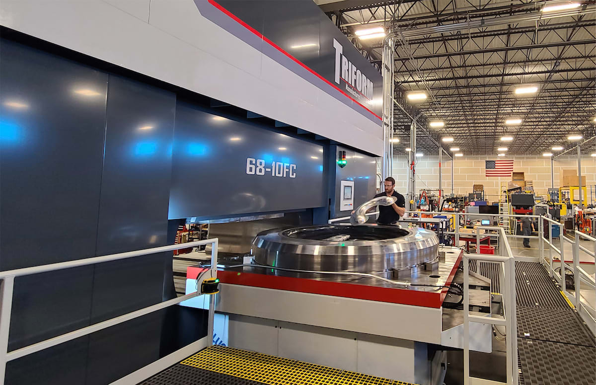 Beckwood Press Company (St. Louis, MO) recently delivered a Triform model 68- 10FC Fluid Cell Sheet Hydroforming Press to a major supplier of space launch vehicles. This machine features a 68-in. diameter round forming area that can hold one large tool or multiple smaller tools simultaneously. Once the tooling and blank are loaded, they are transported into the press via an automated hydraulic shuttle system. The operator then sets the optimal forming pressures (up to 10,000 psi) and the desired dwell times, if any. Operators can program up to 10 individual steps, selecting the desired pressure and dwell time for each. Up to 500 recipes can be stored in the HMI for easy recall. During the cycle, a pressurized rubber diaphragm acts as a universal die half, applying equal pressure over every square inch of the part’s surface.
