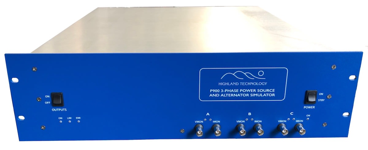 Highland Technology (San Francisco, CA) has introduced the P900, a 3-phase AC power source and alternator simulator. It can simulate aircraft power busses and PMA permanent-magnet alternators and drive FADEC shunt regulators. Each phase can output 0 to 160 VRMS at 200 VA and 120 Hz to 4 kHz, including applications requiring a 400 Hz or APU/wild power source. Outputs can be programmed as low-impedance voltage busses or alternators with controlled source impedances. Features include output measurements, waveform monitors, and fault simulation. Control interfaces are USB and Ethernet. The P900 is packaged in a 3U aluminum rackmount enclosure and operates from single-phase AC power.