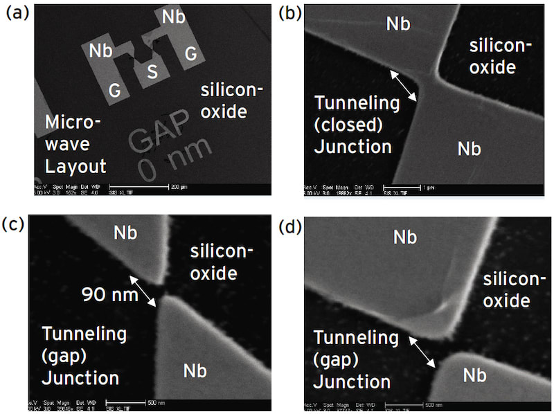 After dose testing, resist development and bake SF6 etching was done to define the lateral niobium nanoscale patterns, followed by two cycles of O2 plasma etching and SF6 etching to clean the surface. Layouts were developed in a complete microwave layout as shown in Figure 1a where the device is arranged in a ground-signal-ground configuration. The layout was made where the gap region of the active tunneling junction was varied from closed configurations in Figure 1b to opens in Figure 1c and 1d with varying gap length. The open junctions were formed specifically to enable deposition of novel functional materials in the tunneling gap region, such as a S-B-I-B-S structure previously examined, or other structures as desired by the application.
