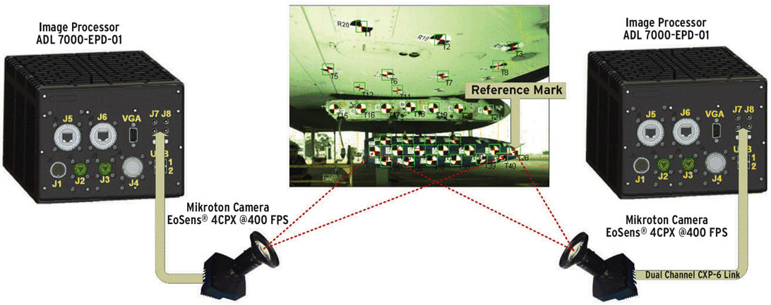 The ADL 7000-EPD-01 image processor acquires 400 fps images, so the 2D coordinates of all in-view RM can be determined by the image processor and routed to the trajectory processor. In parallel, ADL 700-EPD-02 computes the 3D coordinates of each RM and then makes the conversion to a 6DoF CG trajectory of the released store.