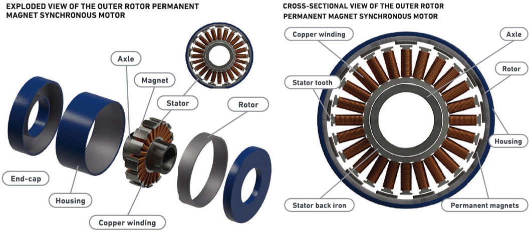 The outer rotor permanent magnet synchronous motor (OR-PMSM) design utilized in UAVs, as depicted in Figure 2, is useful for direct-drive applications. Carpenter Technology modeled the motor for a desired UAV flight cycle to compare performance using a drop-in replacement material in the stator core through finite element analysis.