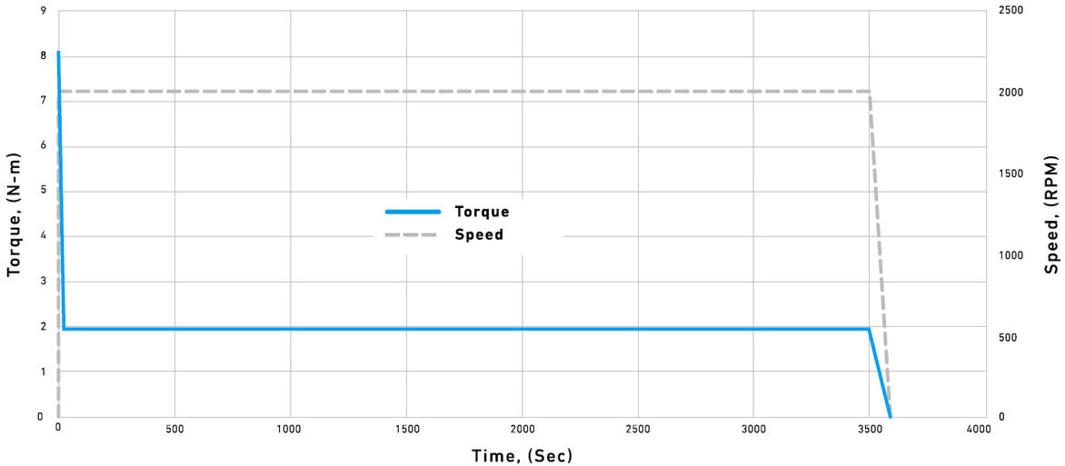 For the comparison, stator cores of both silicon steel and Hiperco 50A were utilized, each with a lamination thickness of 0.25 mm. Because the use of soft magnetic materials in the stators does not improve performance enough to be cost-effective, both models’ rotor cores consisted of silicon steel laminations, and NdFeB magnets with 42 MGOe were used as the permanent magnets. The varying stator cores were interchanged, and the motor was modeled between the two materials. The motor modeling was completed with a flight profile to ensure the thermal boundary conditions of the operation. The motor accelerated from 0 to 2500 rpm in five seconds and was then run at a constant speed for 60 minutes (Figure 3). The 60-minute flight time provides a thermal envelope to the motor operation, making the model a realistic drone flight simulation.