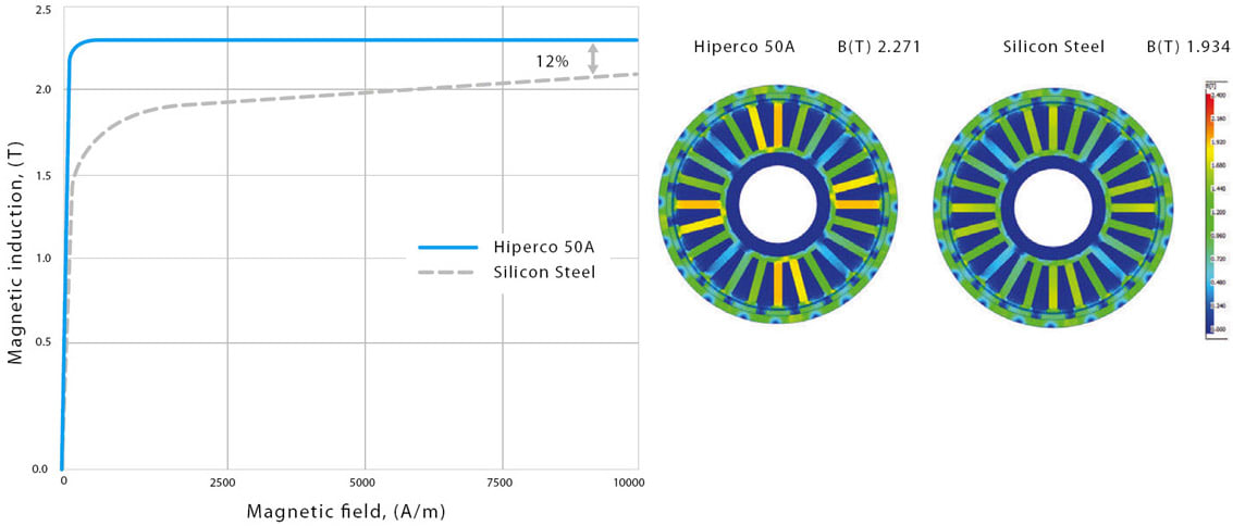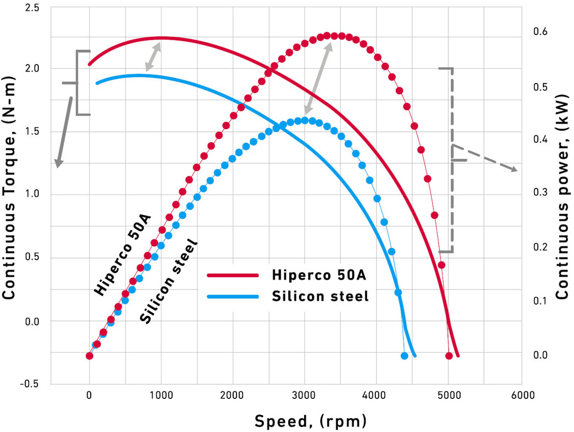 The modeling analysis found that the Hiperco 50A core-based motor performed substantially better than the silicon steel core stator-core motor, providing the following benefits: