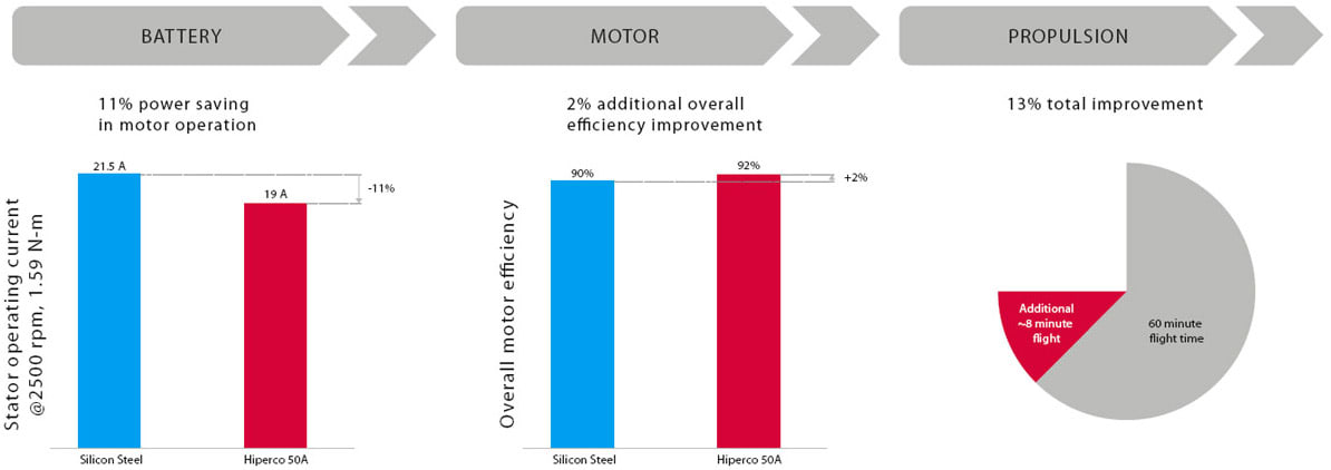 The power-dense motor with the Hiperco 50A core is also more efficient than the silicon steel core motor. A 2% increase in overall power efficiency and a stator phase current 11% lower was measured utilizing Hiperco 50A cores compared to silicon steel. The torque of a motor is a product of the magnetic flux injected into the circuit. Motors with more magnetic force require less current to produce the same or increased torque. Thus, motors operating at lower currents can benefit from proportional power saving to the battery while the drone is operational, making high thrust, low current drawing motors ideal for drone applications. The overall efficiency of the propulsion system increases by 13%, translating to an increased flight time by eight minutes (for the simulated 60 min flight time).