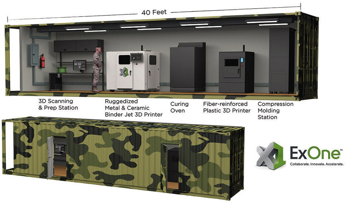 The ExOne Company, which specializes in industrial sand and metal 3D printers using binder jetting technology, was awarded a U.S. Department of Defense contract to develop a fully operational, self-contained 3D printing “factory” housed in a shipping container. Currently under development, the rugged 3D printing factory pod would be set up in a standard shipping container, up to 40 feet long, to be deployed directly in the field, via land, sea or air, to manufacture parts to support war theaters, disaster relief, or other remote operations. ExOne’s 3D printers can produce parts in more than 20 metal, ceramic or composite materials.