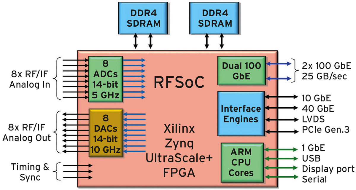 To make this more manageable, the RFSoC was introduced by Xilinx in 2018 (Figure 1). Based on its UltraScale+ FPGA Zynq architecture, the RFSoC includes eight ADCs sampling at 4 GS/sec and eight DACs sampling at 6.4 GS/sec. These are connected directly to the Zynq FPGA fabric, eliminating the power, connections, complexity, and latencies of external interfaces to discrete data converters. An onboard, multi-core ARM processor acts as a system controller with control/status I/O; two 100-GbE interfaces connect the RFSoC to external devices supporting 24 GB/sec data transfers in both directions.
