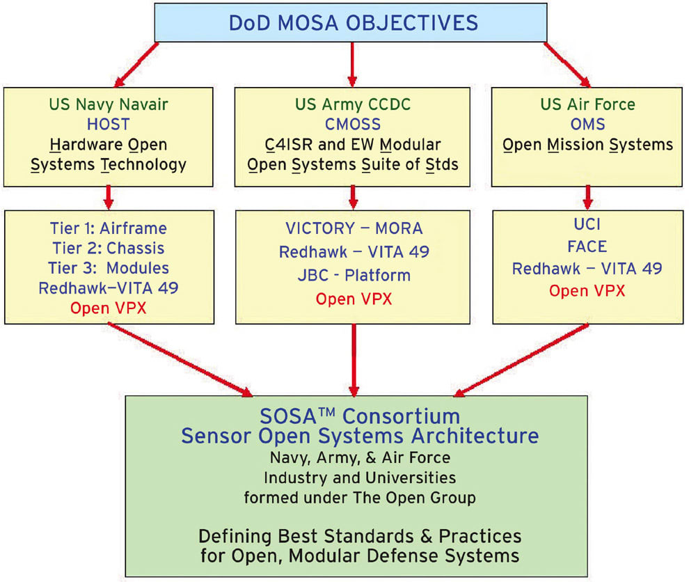 The primary U.S. service branches (Army, Navy, and Air Force) responded to the OSA mandate by developing OSA aligned standards to meet the future procurement needs of deployed systems. Five years later, it was apparent that the three services had many common elements, inspiring the formation of the SOSA Consortium to unify these initiatives.
