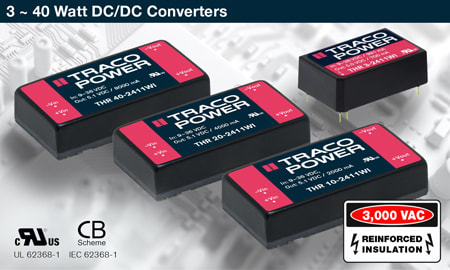 TRACO Power North America (San Jose, CA) announced their new THR-WI series of 3 / 10 / 20 / 40 watt DC/DC converters with double/reinforced insulation providing up to 3,000 VAC Isolation. These products operate over an ultra-wide 4-1 input range with up to 90% efficiencies and operating temperatures from -40°C to +80°C (105°C maximum case temperature). THR 3 (3 Watt) models offer DIP 24 footprints and the THR 10 / 20 / 40 (10 / 20 / 40 Watt) come in 2×1" footprints. Input ranges include 9~36 / 18-75 / 40~160 VDC and provide single & dual outputs ranging 5~24 VDC. Models are fully encapsulated to withstand shock and vibration standards per IEC / EN 61373. Internal input filters enable EN 55032 class A compliance (3 /10 / 20 watts) and overload, overvoltage and short-circuit protection.