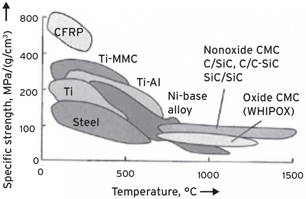 Ceramic matrix composite (CMC) materials have been developed as successors to superalloys. These composites maintain their properties at high temperatures due to the nature of the constituent ceramic materials while also benefiting from a reinforcement phase, which increases toughness compared to a monolithic or bulk ceramic. The accompanying figure shows general regions of operating temperatures and specific strengths for comparison of superalloys, CMCs, and various other materials. The weak bonding between the matrix and reinforcement phases of CMCs prevents brittle, catastrophic failure exhibited in a bulk ceramic due to deceleration of crack propagation and a simulated ductile region caused by matrix failure prior to reinforcement failure.