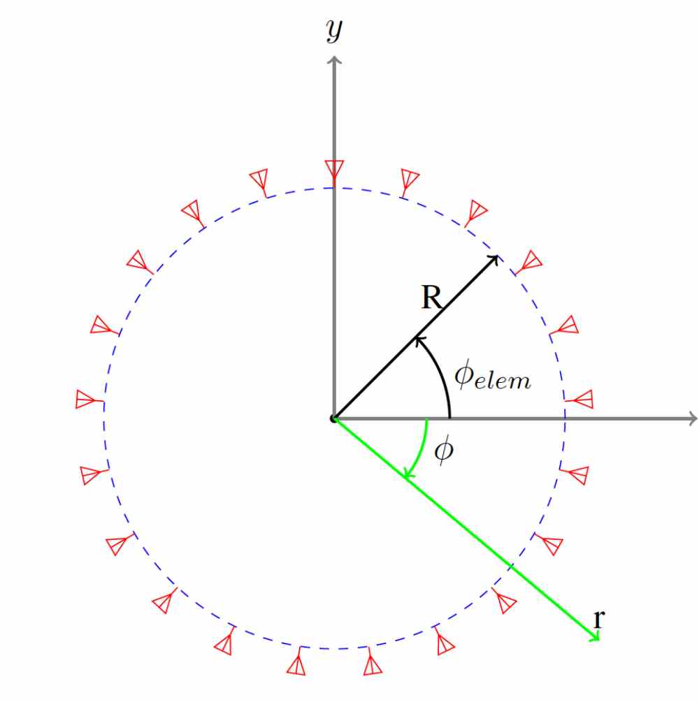 An N-element circular array of radius R. This diagram shows the array elements (red) and far-field vector (green).