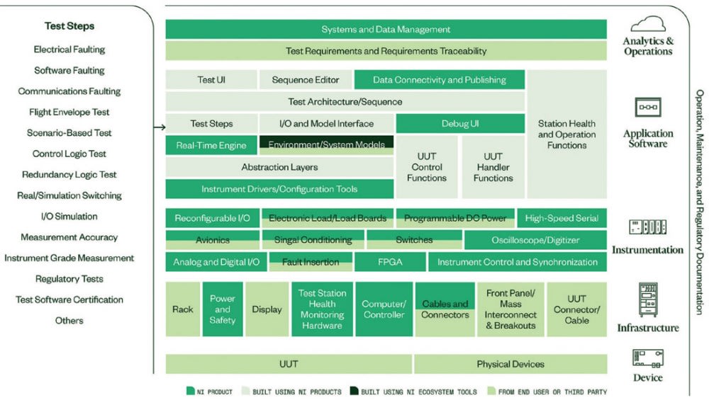 Connectivity, switching, and signal conditioning: These systems often depend on the controller or system under test and can include any number of mass interconnects, cables, resistor networks, and more. These are also the components that technicians and test operators spend hundreds of hours adjusting, reconnecting, disconnecting, and reconfiguring to account for different controller configurations and in-flight scenarios.