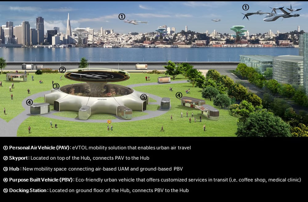 In conjunction with the S-A1 aircraft, Hyundai’s also revealed a new infrastructure concept called the Hub. The intent is for many types of electric wheeled and non-wheeled purpose-built vehicles (PBVs) to dock and connect to a Hub for connecting air and ground trips.