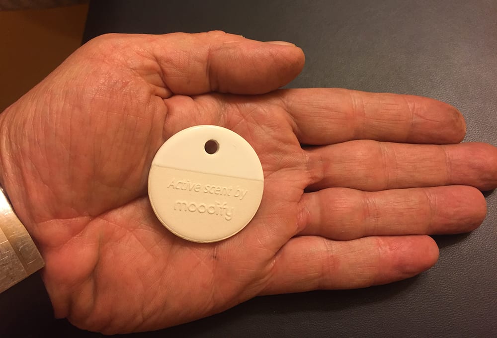 Moodify White, he said, is so-named because it acts like “white noise” for the nose, helping to eliminate perception of bad odors. Sharon said the scent, demonstrated on a small ceramic disc about the size of a 50-cent piece, could be particularly useful for rideshare vehicles, helping each successive new rider tune out any unpleasant odors lingering from prior use. He added that the company also envisions a market for Moodify White with used-vehicle dealers and rental-vehicle agencies, where the potential to eliminate the perception of distasteful odors would be an obvious asset.