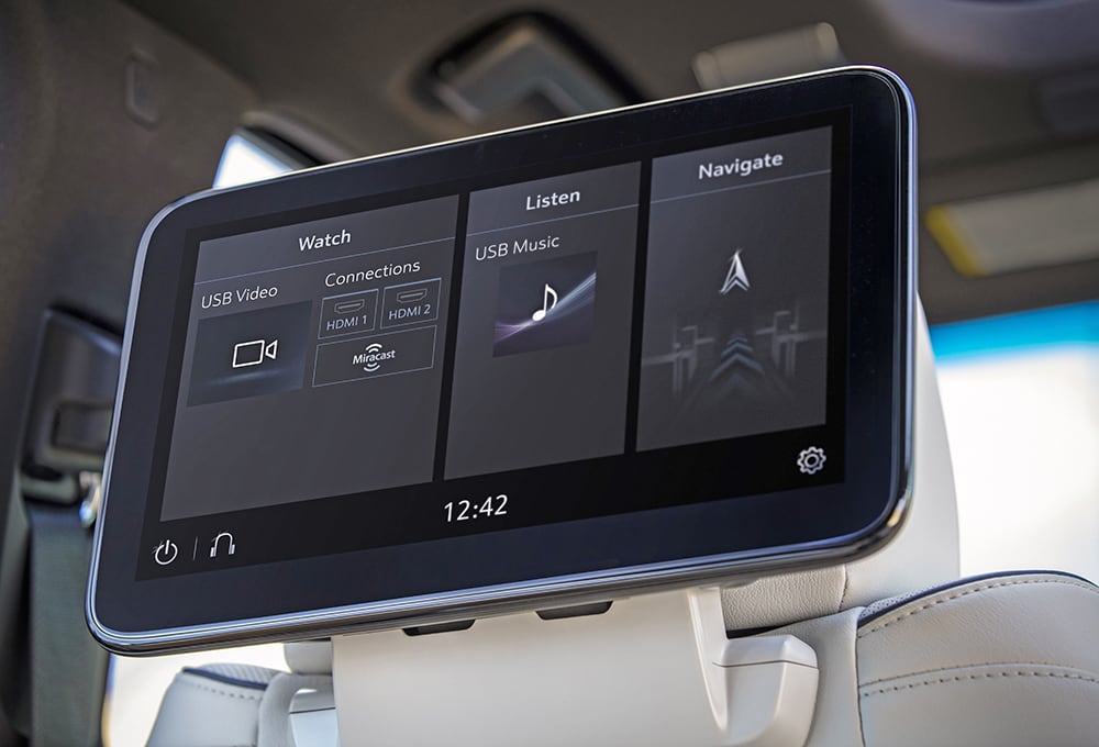 Though not OLED, second-row occupants get their own screen fix, with optional 12.6-in LED displays mounted on each front seatback. Each has its own USB and HDMI inputs, and the touchscreen displays are impressively integrated with the Escalade’s infotainment network. Front-seat occupants can browse and select content to send to either rear screen and also monitor audio feeds to see what the kids are listening to. Rear-seat passengers can pull up live navigation and even suggest destinations to the driver. Content can be shared with the other rear-seat occupant simply by swiping toward the other screen.