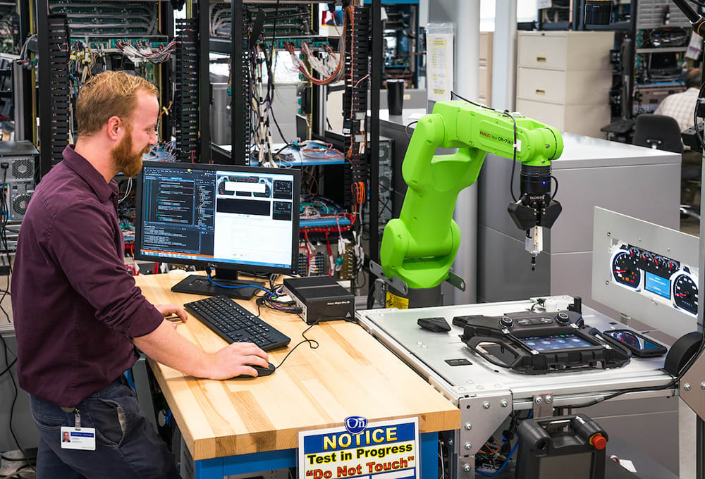A full-system test bench, an active safety bench and a harness verification frame are used in the validation lab to assure comprehensive and safe testing. Meanwhile, a specially outfitted lab tests up to 90% of current combinations of the new system’s infotainment functions; one part of the lab features a robotic testing rig that runs 24-hours-a-day to mimic user actions to identify potential functionality or compatibility issues. The lab also includes a station dedicated to validating Bluetooth and wi-fi connectivity for a spectrum of current mobile phones and upcoming models.
