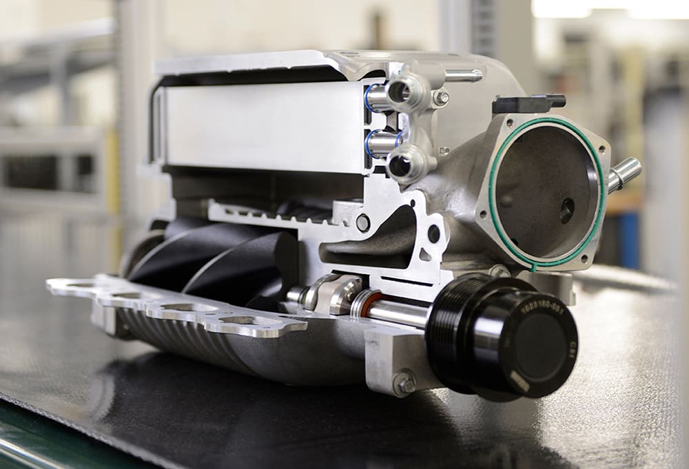 The Eaton-developed 2.65-L supercharger – the biggest one the company makes, Eaton engineers gleefully confirmed – is cleverly fitted into the valley between cylinder banks in an inverted position, with its meticulously-clearanced aluminum lobes and other heavy components located at the bottom of the blower housing to reduce the unit’s center of gravity.