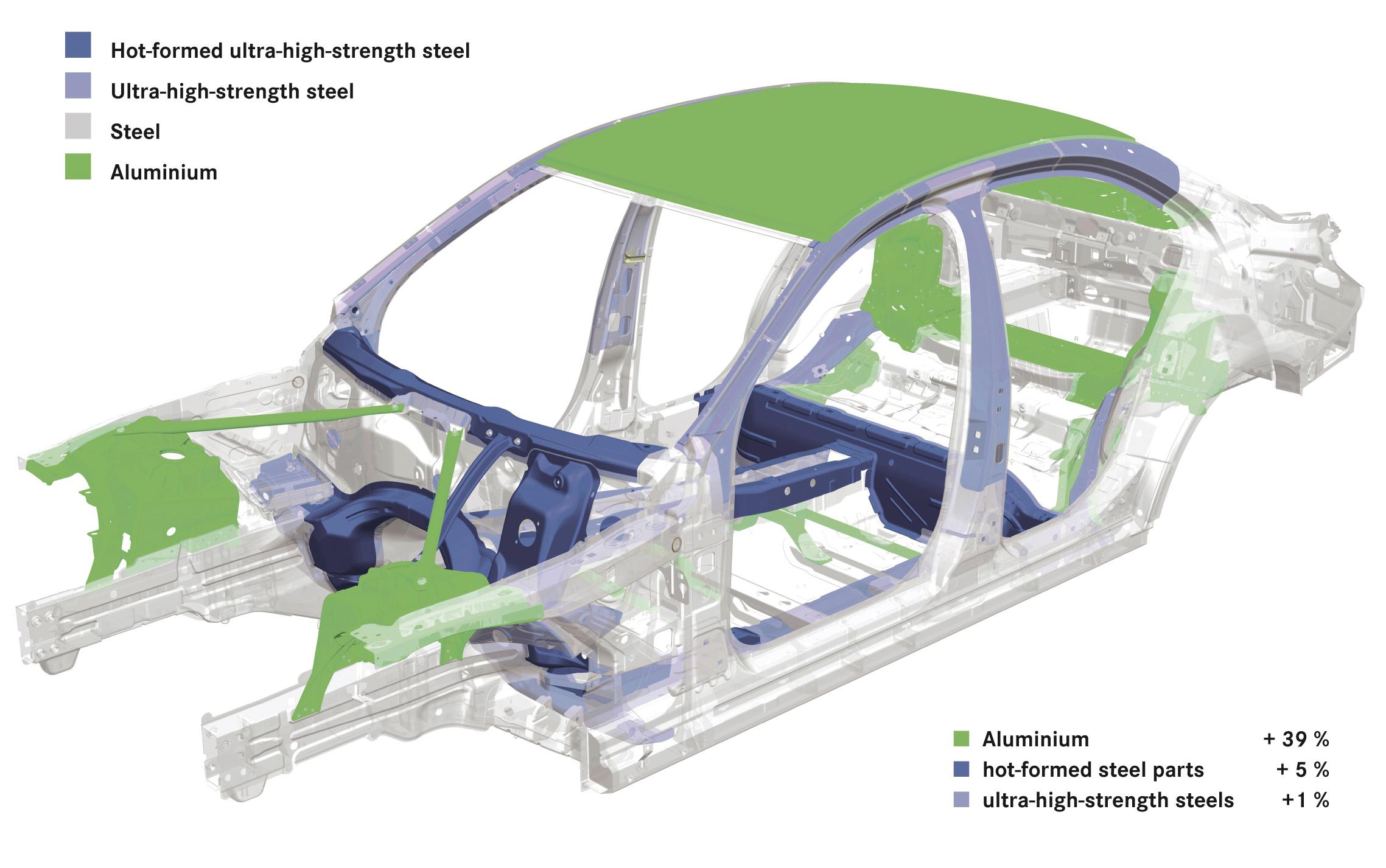 Use of a hybrid materials strategy, with most exterior panels in aluminum, helps towards fuel reductions of up to 20%. The body-in-white is around 70 kg (154 lb) lighter.