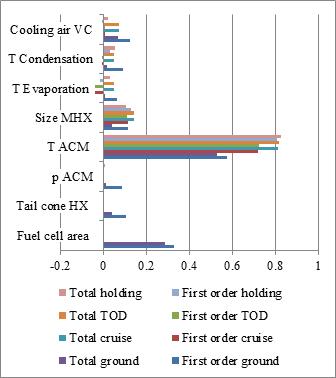 Figure 3 shows the system mass sensitivity for four flight phases. The control of the air cycle machine has the highest sensitivity in all flight phases. As the ACM is an essential consumer of electrical current, ACM design influences the EECS mass as well as the fuel-cell system mass. So, the combined system development is necessary to find the optimal system architecture, the ACM being the driving subsystem.