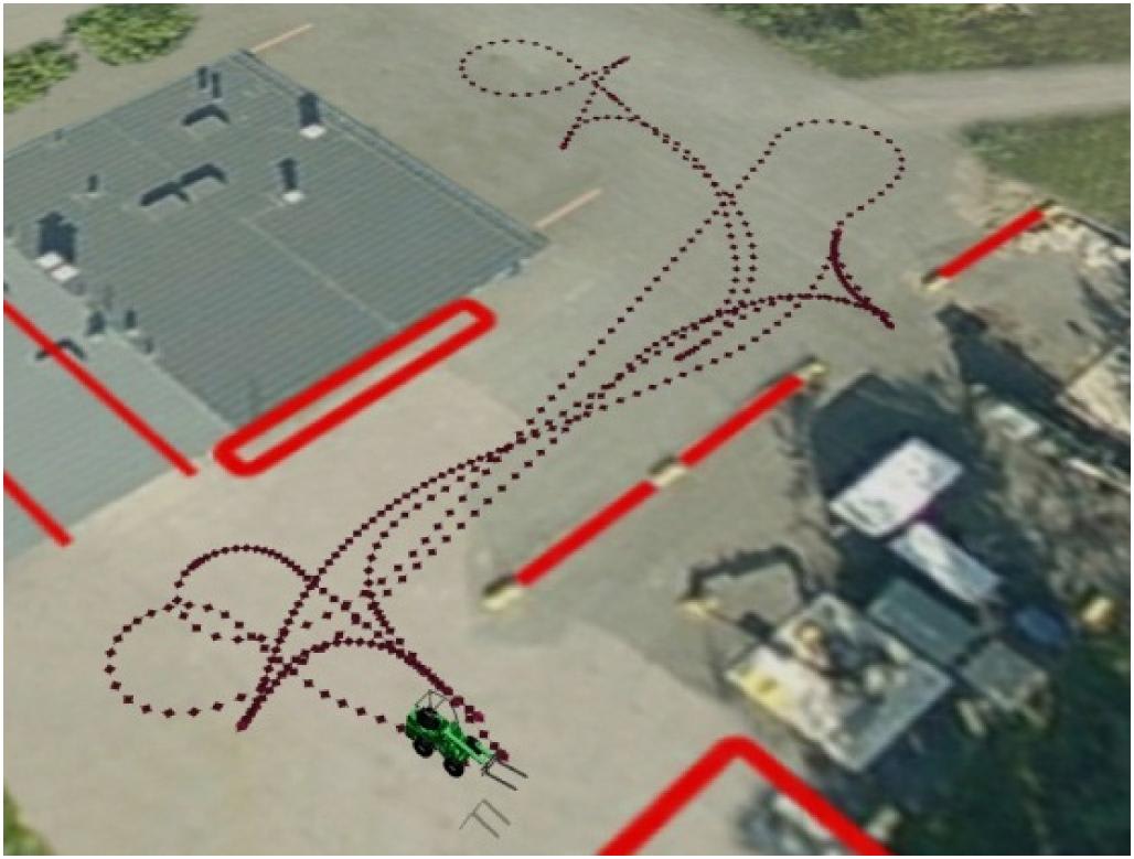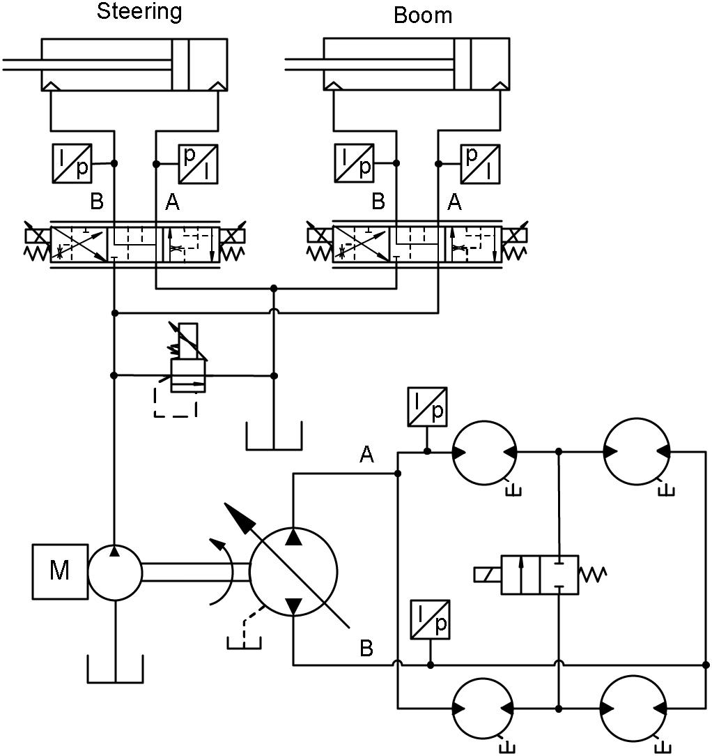 In this case, a hydrostatic transmission was implemented with an electronically actuated variable displacement pump and fixed displacement motors. Steering was executed by a hydraulic cylinder. The stroke of the steering cylinder was controlled by means of an electronically actuated proportional valve as well as other cylinders (boom, telescope, and bucket) in the working hydraulics.