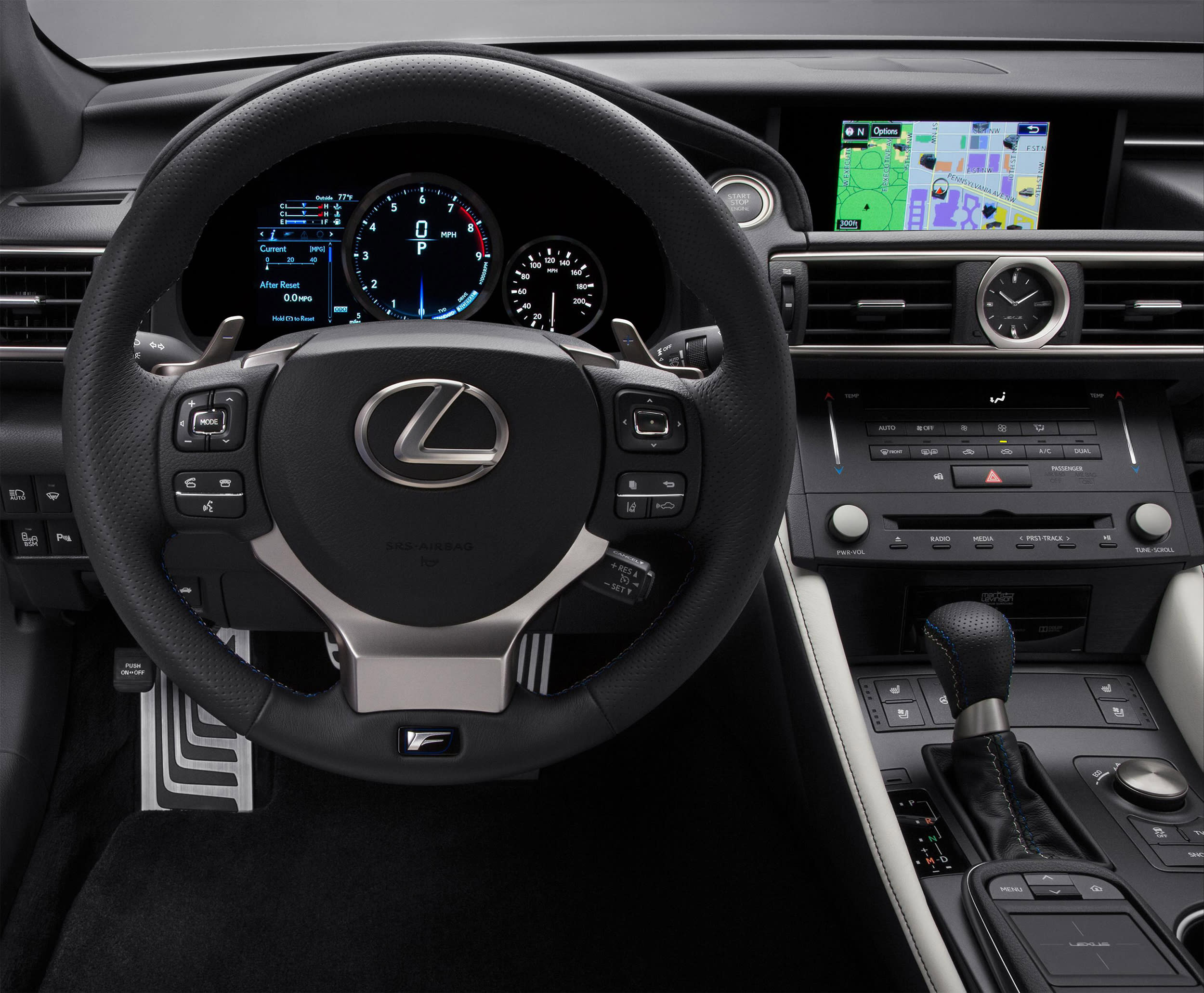 That power is channeled through an eight-speed automatic transmission to Toyota’s first torque-vectoring rear differential. The transmission features Lexus’ Sports Direct Shift technology, which the company says contributes to improved linearity of throttle response. The torque vectoring system has three operating modes: standard, which is meant to provide a balance between nimble performance and stability; slalom, which emphasizes steering response; and track, which helps with consistent stability to help the RC F hold its line rather than understeer as the driver holds the accelerator pedal to the floor.