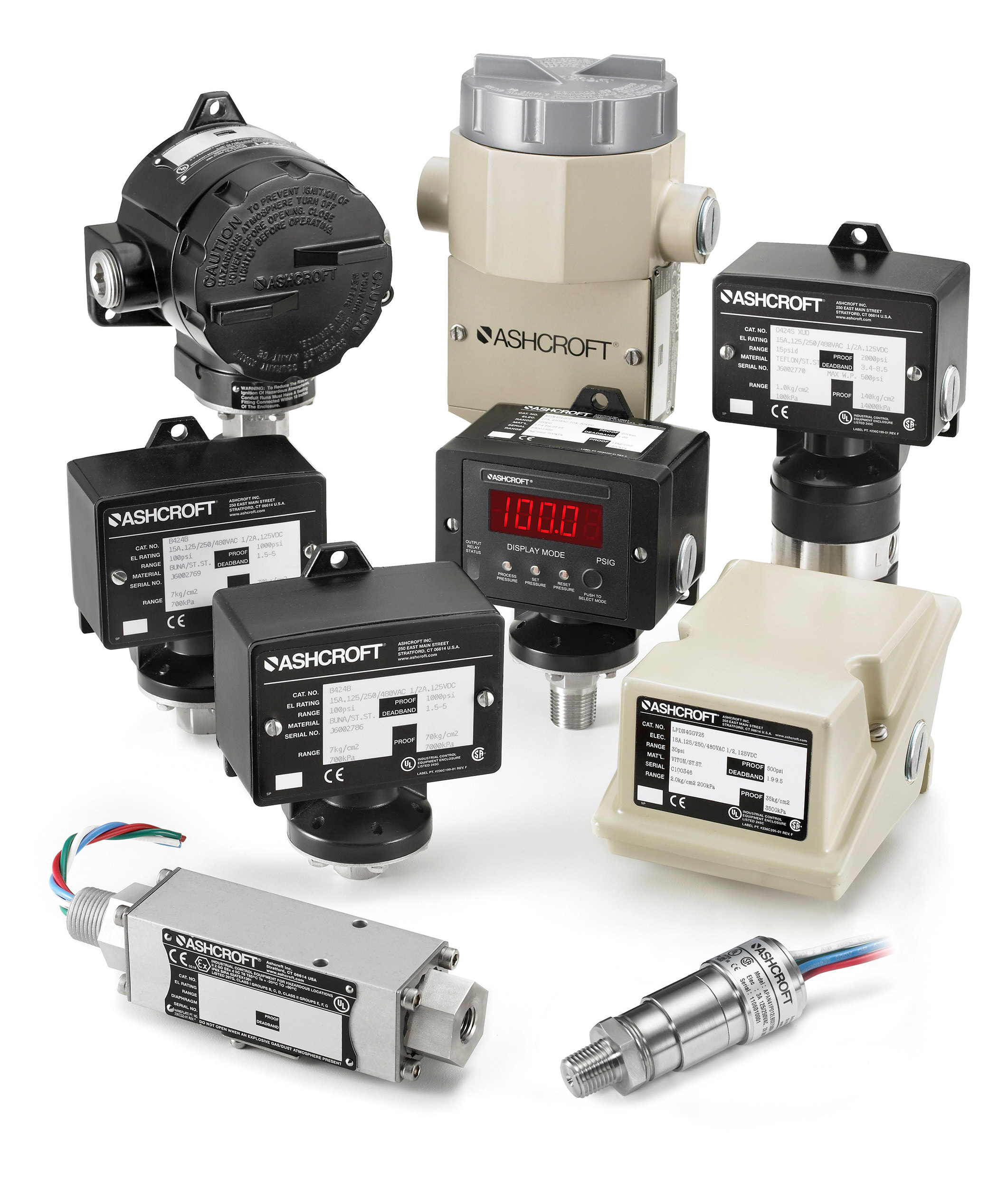 Ashcroft pressure switches offer a selection of features to meet the requirements of most industrial applications. Available in a variety of sizes and configurations, the switches can be provided with NEMA 4 watertight and NEMA 7 explosion-proof housings. Each switch can be constructed with a variety of diaphragm materials, sanitary connections, or with external media isolators for specialized installations. A wide choice of ranges from 0/10 in H2O to 0/7500 psi and up to 600 psid complete the product offering. Some models include approvals by FM, CE, ATEX, UL, CRN, CSA, IECex, and may be available with a dual-seal rating and SIL capability.
