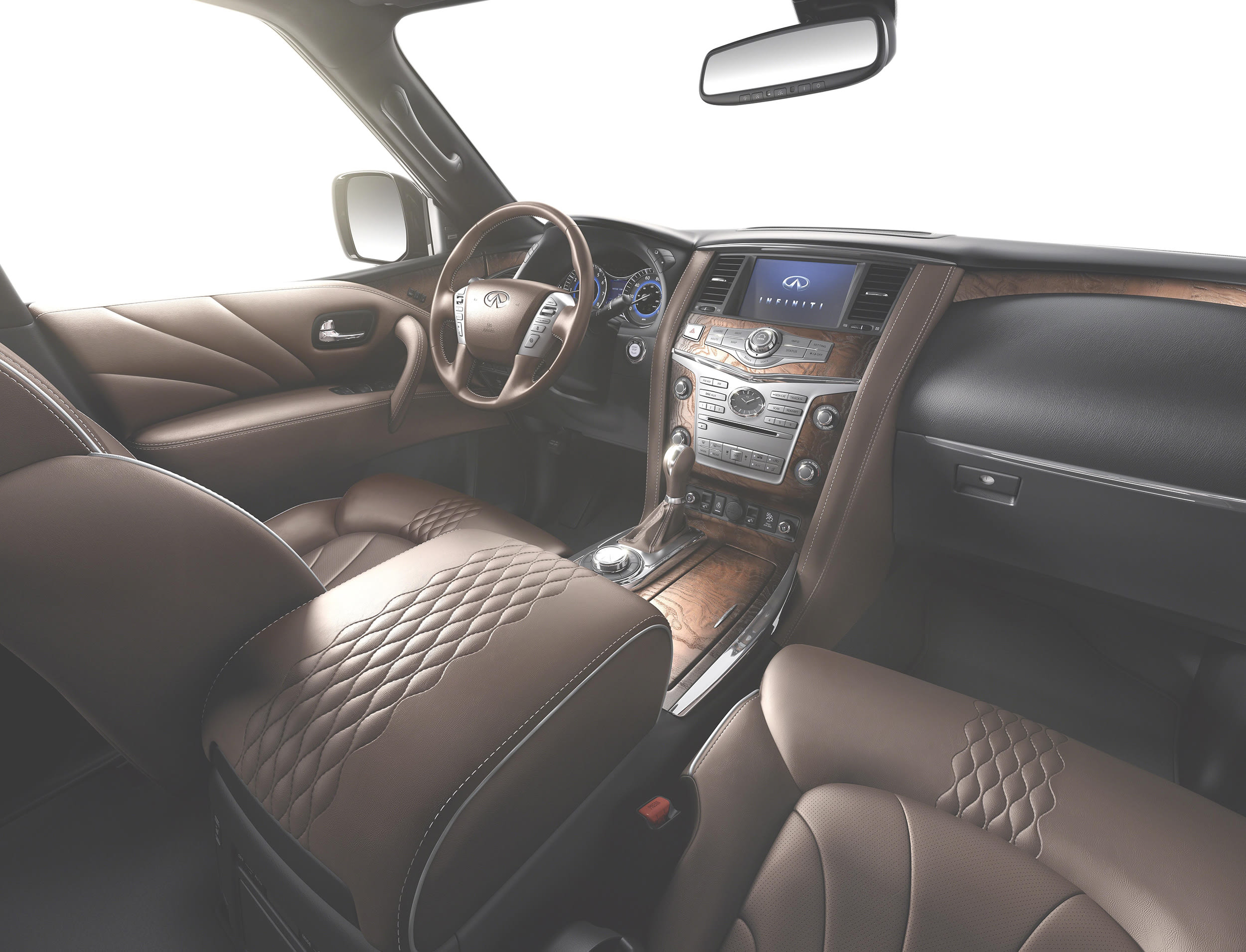 The QX80 Limited, which goes on sale late this year, rides on 22-in wheels. It is powered by a 5.6-L V8 with variable lift and valve timing and an output of 400 hp (298 kW) and 413 lb·ft (560 N·m). Output to the wheels is through a seven-speed automatic into the all-wheel-drive system, which has Auto, 4H, and 4L modes and can transfer up to 50% of the torque to the front wheels. Tow capacity is up to 8500 lb (3855 kg). The vehicle has automatic rear leveling and a hydraulic body motion control, basically automatic sway control to keep the vehicle level in sharp turns.