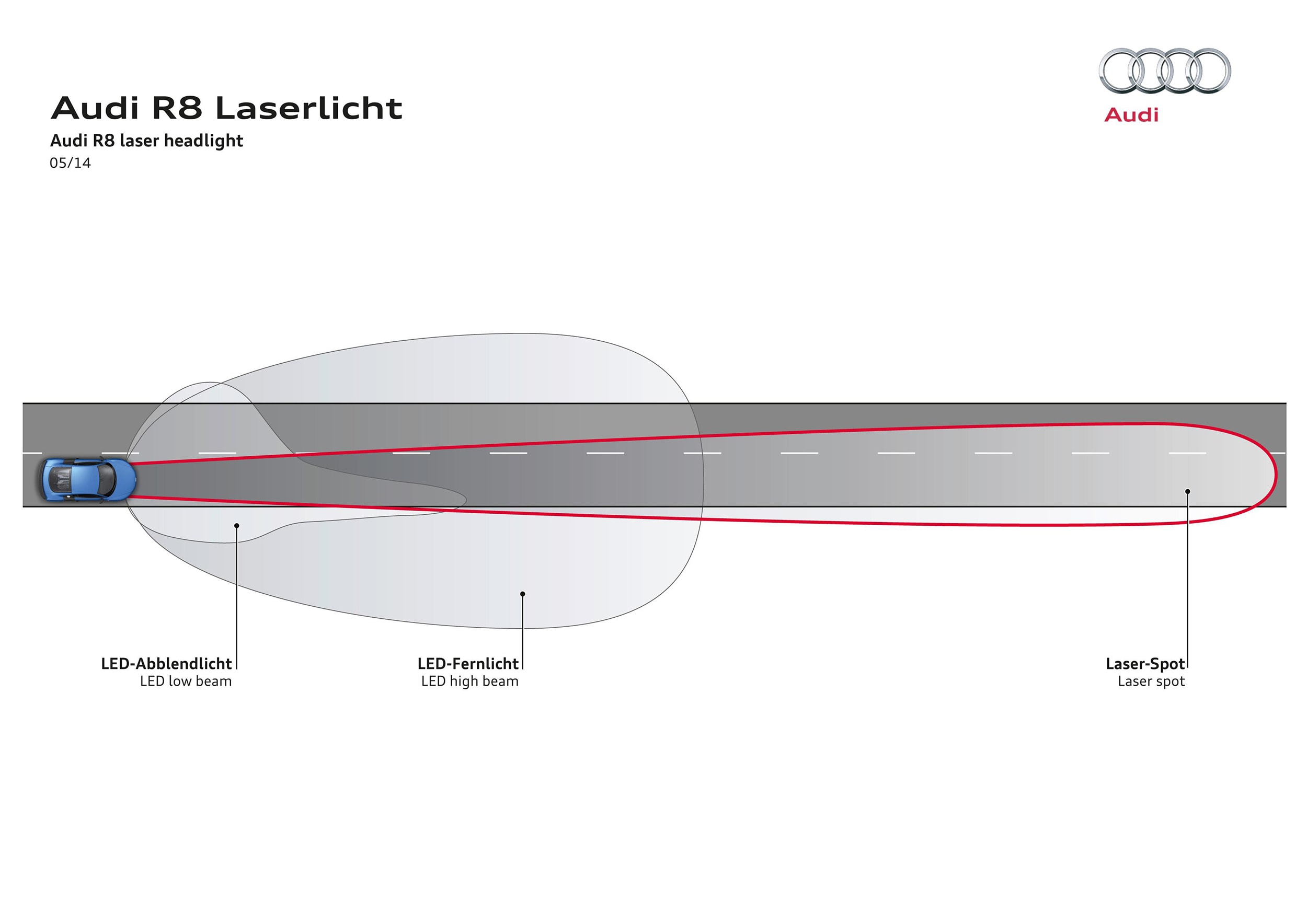 For the R8 LMX, lasers are used for the high beams to increase lighting range substantially. The laser spot light, which is active at speeds of 60 km/h (37 mph) and above, supplements the LED high beam in the R8 LMX. The production application was developed from technology that will be used for the first time on the new Audi R18 e-tron quattro at the 24 Hours of Le Mans race in June.