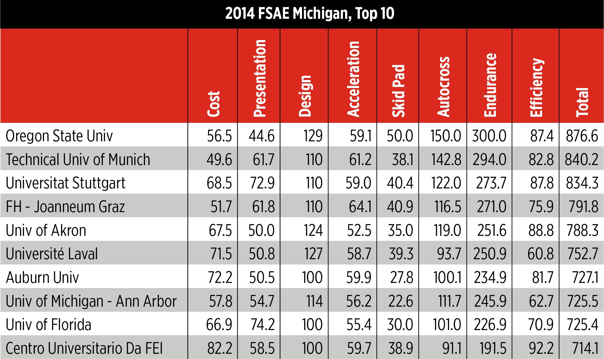 Oregon State University’s Global Formula Racing (GFR) team took top honors with a total score of 876.6 at the 2014 Formula SAE Michigan competition, held May 14-17 at Michigan International Speedway in Brooklyn, MI. It is the team’s fourth first-place victory at the event in the past five years, previously claiming titles in 2010, 2011, and 2012.