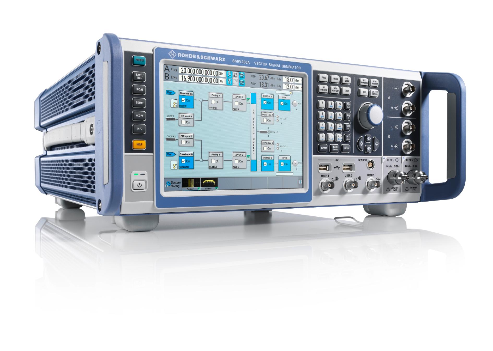 The R&S SMW200A high-end vector signal generator from Rohde & Schwarz supports frequencies up to 20 GHz. The system makes it possible to generate two wideband signals with any type of modulation up to 20 GHz using a single device. Even fading and multiple-input/multiple-output scenarios can be configured over the entire frequency range. Using informative block diagrams on a touchscreen, users can quickly configure the relevant signal parameters. The vector signal generator also delivers phase-coherent signals for testing phased array antennas. If more than two phase-coherent signals are needed, extra generators can be added. An integrated test case wizard enables users to configure complex test scenarios at the press of a button.