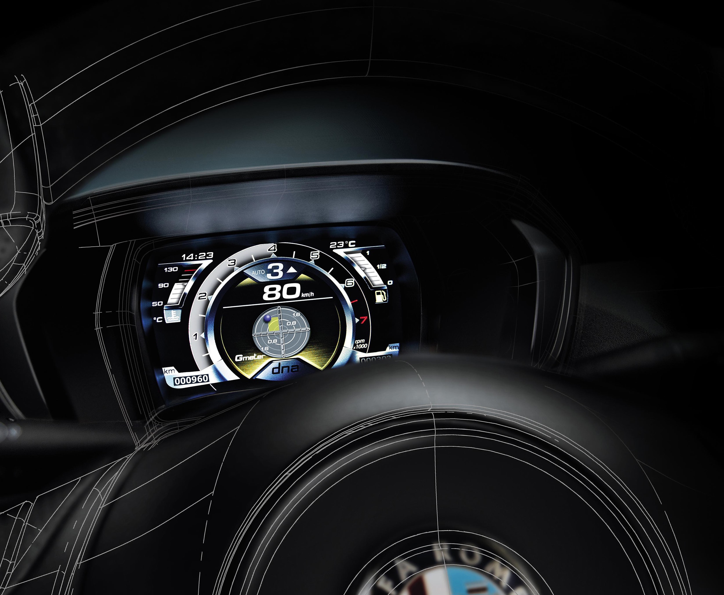 As much as the structure has been designed around the car’s ability to carve the road, an equal amount of design has been put into the electronic technology.The 4C is equipped with a mode selector that allows the driver to change the car’s level of performance according to the environment that he or she finds themselves. The four modes—Dynamic, Natural, All-Weather, and Race—allow adjustment of throttle calibrations and stability control. All-Weather mode, for instance, softens the throttle calibrations and increases the stability control intervention. Race mode completely disables the stability control and stiffens the throttle, allowing for a responsive driving experience. The 4C’s full-color instrument cluster is also in tune with these driving modes, signaling a change in performance with different colors and read-outs. In Race mode, the cluster changes altogether, reflecting the power and advanced technology with a "g-force" map.