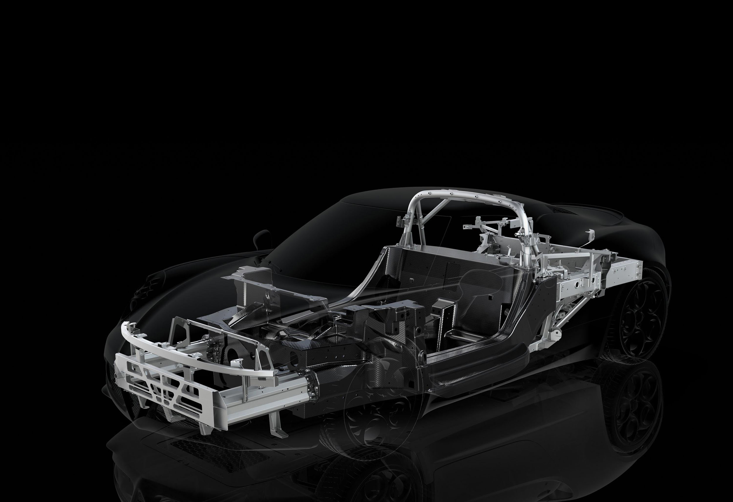 The Alfa Romeo team continued with their lightweight mindset, structuring the front and rear subframes with aluminum. The body is primarily made of SMC (sheet molding compound), which enabled a 20% weight reduction in comparison to traditional sheet steel. According to the company, the 4C is the first standard production car to achieve such a high percentage of low-density SMC. This, along with the carbon-fiber monocoque, aluminum for the roof reinforcement cage and the front and rear frameworks, and PUR-RIM injected polyurethane on the bumpers and wings, the 4C uses a variety of different materials to help cut weight.